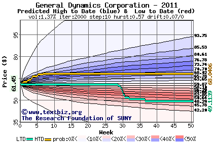 The high to date and low to date prices of the stock plotted against a random walk model for 2011 (what's this?).