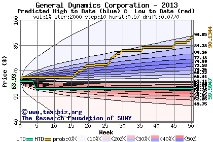 The high to date and low to date prices of the stock plotted against a random walk model for 2013 (what's this?).