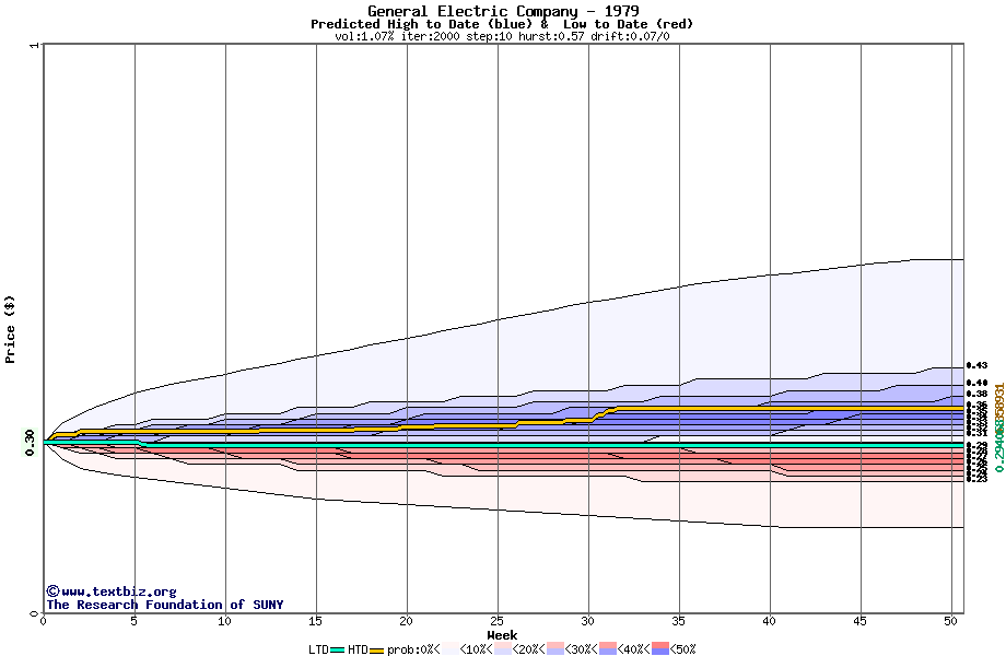 The high to date and low to date prices of the stock plotted against a random walk model for 1979 (what's this?).