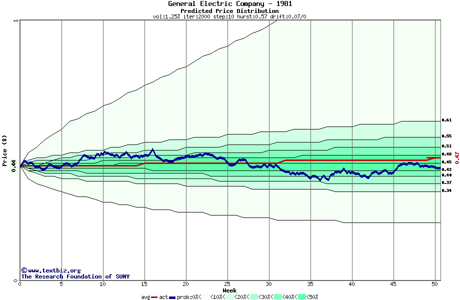 The following graph plots the year-to-date performance of the stock for 1981 compared to the probability calculated by a random walk model.