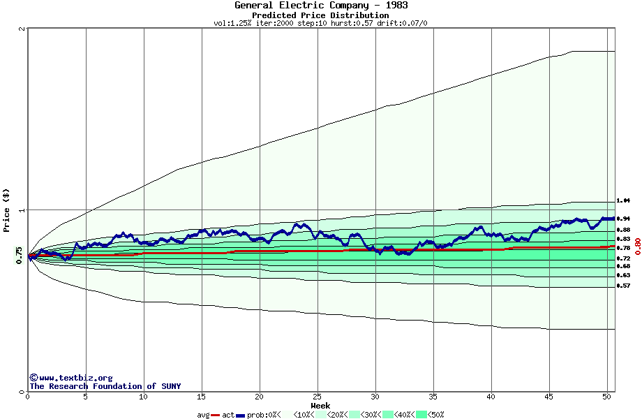 The following graph plots the year-to-date performance of the stock for 1983 compared to the probability calculated by a random walk model.