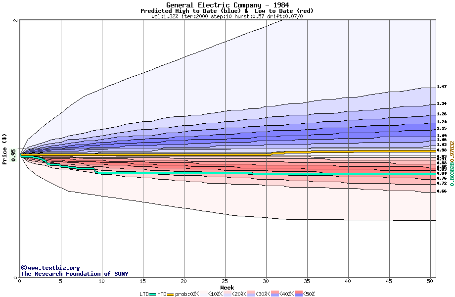 The high to date and low to date prices of the stock plotted against a random walk model for 1984 (what's this?).