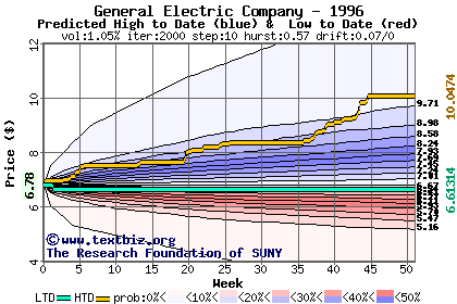 The high to date and low to date prices of the stock plotted against a random walk model for 1996 (what's this?).