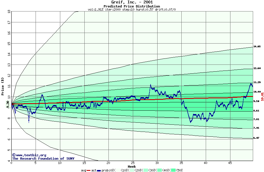 The high to date and low to date prices of the stock plotted against a random walk model for 2001 (what's this?).