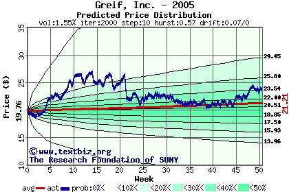 The following graph plots the year-to-date performance of the stock for 2005 compared to the probability calculated by a random walk model.