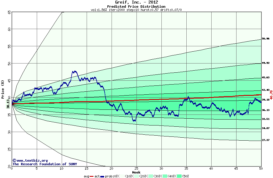 The high to date and low to date prices of the stock plotted against a random walk model for 2012 (what's this?).