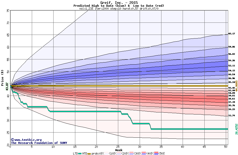 The high to date and low to date prices of the stock plotted against a random walk model for 2015 (what's this?).