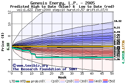 The high to date and low to date prices of the stock plotted against a random walk model for 2005 (what's this?).