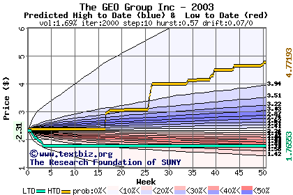 The high to date and low to date prices of the stock plotted against a random walk model for 2003 (what's this?).