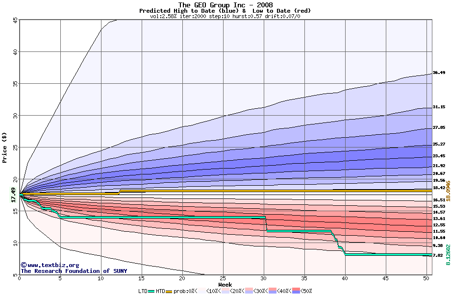 The high to date and low to date prices of the stock plotted against a random walk model for 2008 (what's this?).