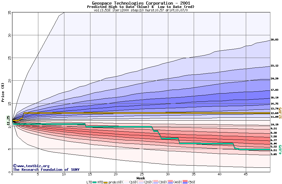 The high to date and low to date prices of the stock plotted against a random walk model for 2001 (what's this?).