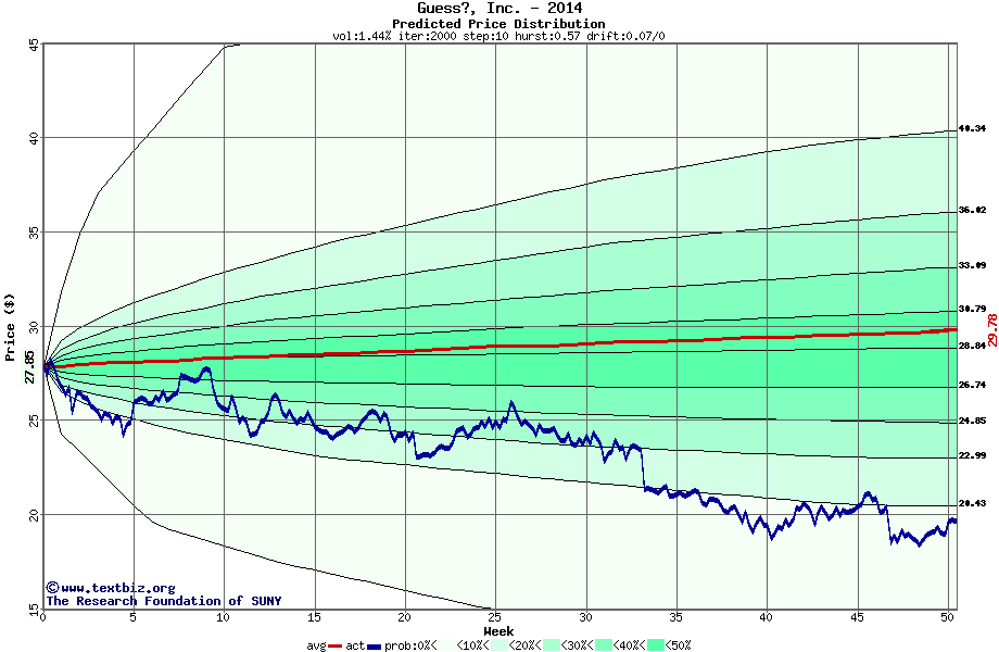 The following graph plots the year-to-date performance of the stock for 2014 compared to the probability calculated by a random walk model.