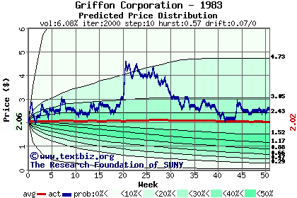 The high to date and low to date prices of the stock plotted against a random walk model for 1983 (what's this?).