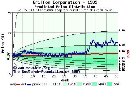 The high to date and low to date prices of the stock plotted against a random walk model for 1989 (what's this?).