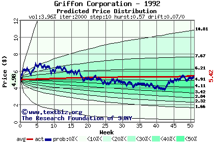 The high to date and low to date prices of the stock plotted against a random walk model for 1992 (what's this?).