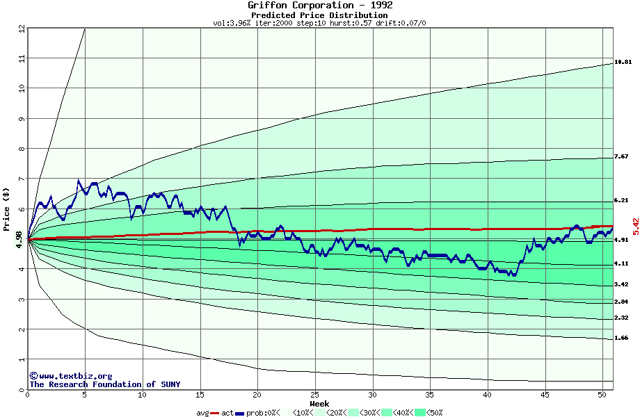 The following graph plots the year-to-date performance of the stock for 1992 compared to the probability calculated by a random walk model.