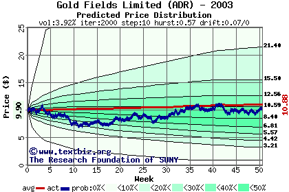 The high to date and low to date prices of the stock plotted against a random walk model for 2003 (what's this?).