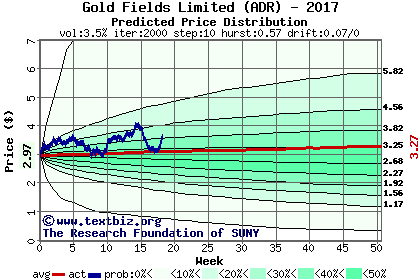 The high to date and low to date prices of the stock plotted against a random walk model for 2017 (what's this?).