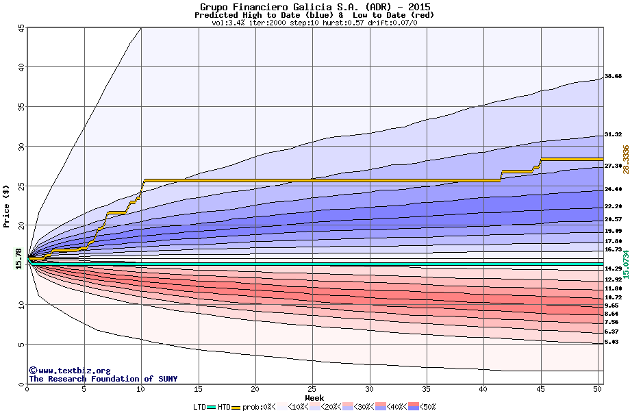 The high to date and low to date prices of the stock plotted against a random walk model for 2015 (what's this?).
