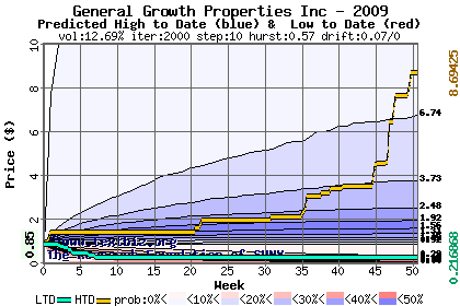 The high to date and low to date prices of the stock plotted against a random walk model for 2009 (what's this?).