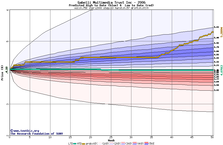 The high to date and low to date prices of the stock plotted against a random walk model for 2006 (what's this?).