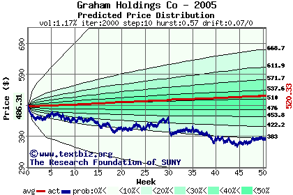 The high to date and low to date prices of the stock plotted against a random walk model for 2005 (what's this?).
