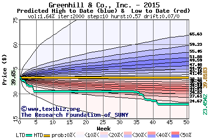 The high to date and low to date prices of the stock plotted against a random walk model for 2015 (what's this?).