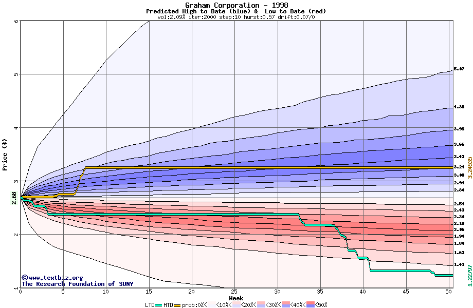 The high to date and low to date prices of the stock plotted against a random walk model for 1998 (what's this?).