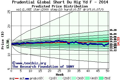 The high to date and low to date prices of the stock plotted against a random walk model for 2014 (what's this?).