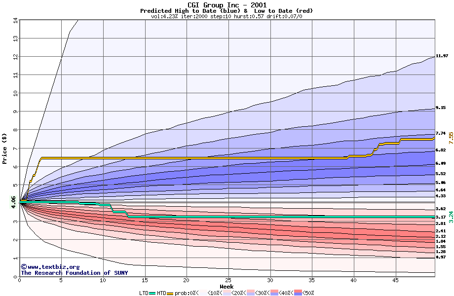 The high to date and low to date prices of the stock plotted against a random walk model for 2001 (what's this?).