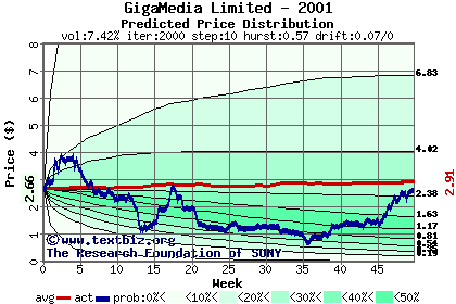 The high to date and low to date prices of the stock plotted against a random walk model for 2001 (what's this?).