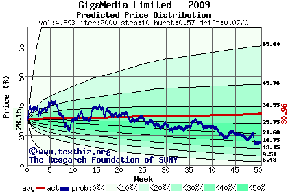 The following graph plots the year-to-date performance of the stock for 2009 compared to the probability calculated by a random walk model.