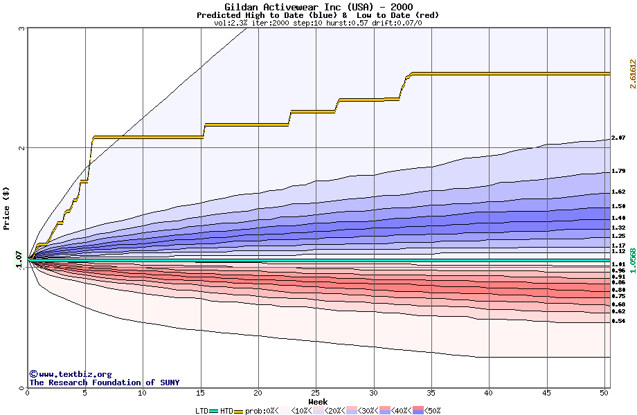 The high to date and low to date prices of the stock plotted against a random walk model for 2000 (what's this?).