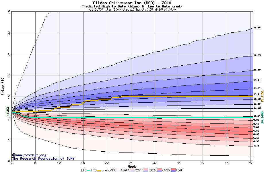 The high to date and low to date prices of the stock plotted against a random walk model for 2010 (what's this?).