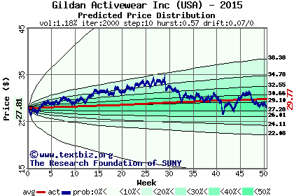 The high to date and low to date prices of the stock plotted against a random walk model for 2015 (what's this?).