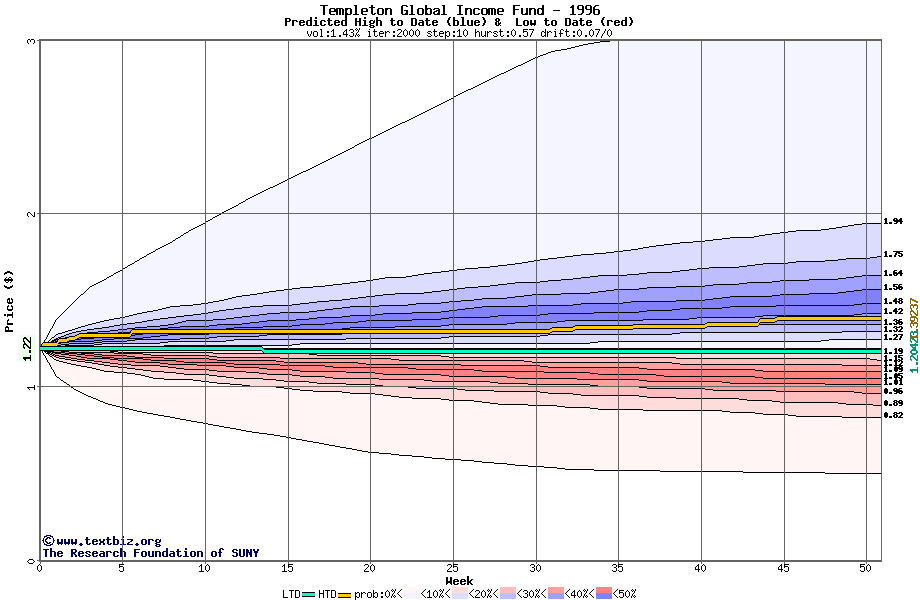 The high to date and low to date prices of the stock plotted against a random walk model for 1996 (what's this?).
