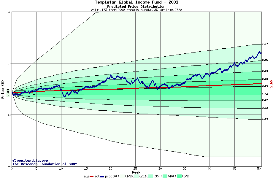 The following graph plots the year-to-date performance of the stock for 2003 compared to the probability calculated by a random walk model.