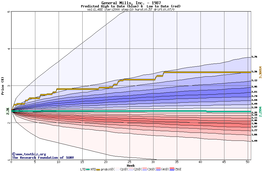 The high to date and low to date prices of the stock plotted against a random walk model for 1987 (what's this?).
