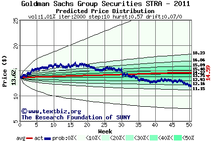 The high to date and low to date prices of the stock plotted against a random walk model for 2011 (what's this?).
