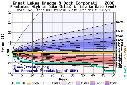 The high to date and low to date prices of the stock plotted against a random walk model for 2008 (what's this?).