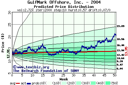 The following graph plots the year-to-date performance of the stock for 2004 compared to the probability calculated by a random walk model.