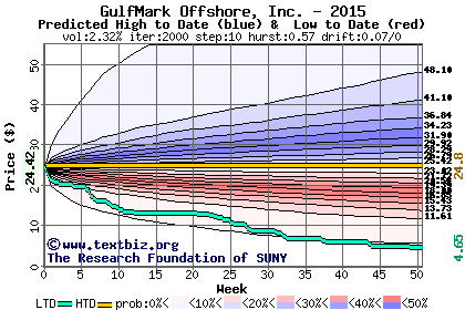 The high to date and low to date prices of the stock plotted against a random walk model for 2015 (what's this?).