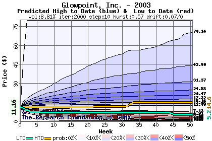 The high to date and low to date prices of the stock plotted against a random walk model for 2003 (what's this?).