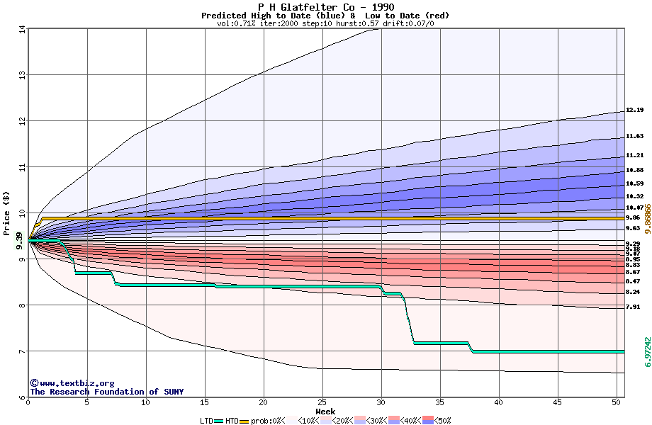 The high to date and low to date prices of the stock plotted against a random walk model for 1990 (what's this?).