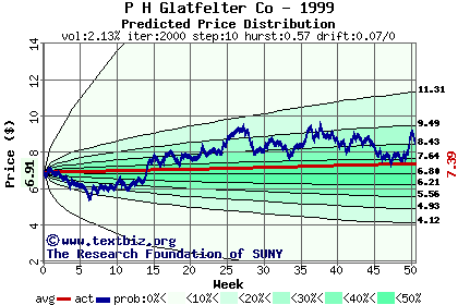 The high to date and low to date prices of the stock plotted against a random walk model for 1999 (what's this?).