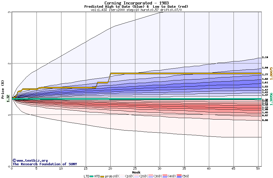 The high to date and low to date prices of the stock plotted against a random walk model for 1983 (what's this?).