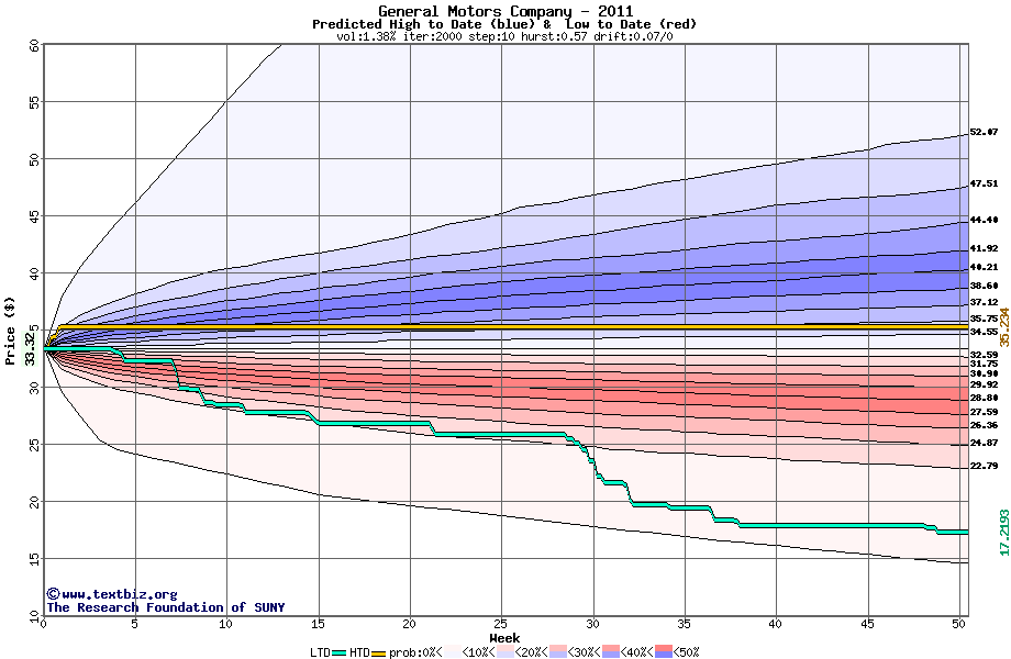 The high to date and low to date prices of the stock plotted against a random walk model for 2011 (what's this?).