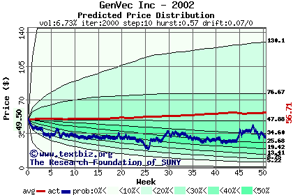 The following graph plots the year-to-date performance of the stock for 2002 compared to the probability calculated by a random walk model.