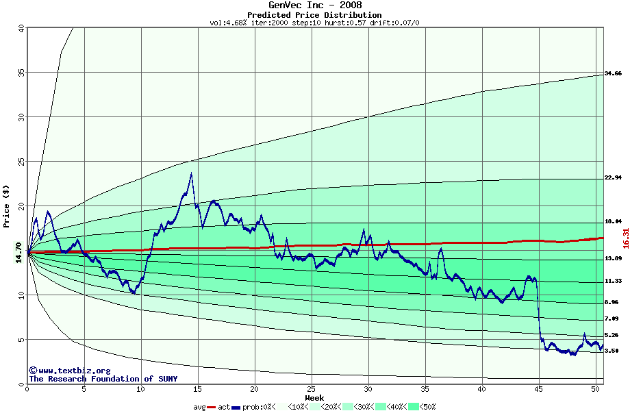 The following graph plots the year-to-date performance of the stock for 2008 compared to the probability calculated by a random walk model.