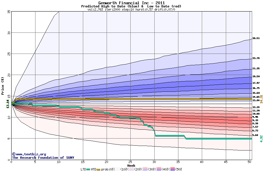 The high to date and low to date prices of the stock plotted against a random walk model for 2011 (what's this?).